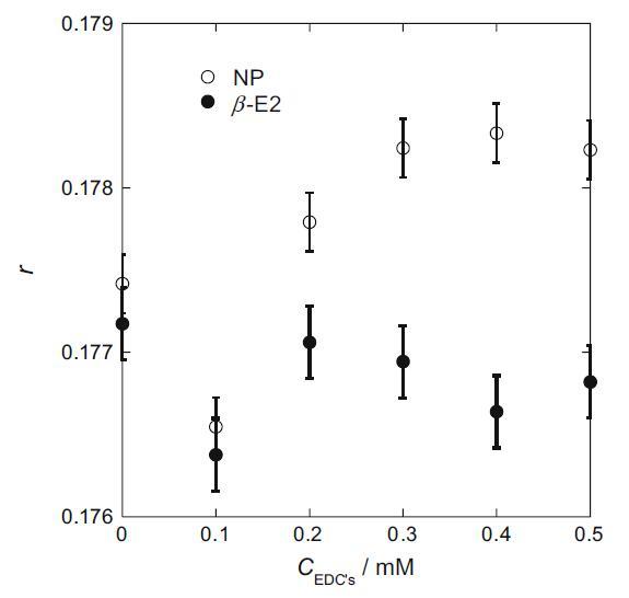RB 分子在膠束表面區(qū)域溶解得越硬,r 值越大[15]。 r 值的變化如圖 3 所示。在 0.1 mM 時(shí),r 值下降。 這表明 EDCs 開(kāi)始溶解到膠束中擾亂了 RB 分子在膠束表面的緊密堆積。 隨著NP濃度的增加,r值增加。 然而,隨著β-E2濃度的增加,r值一度恢復(fù)并似乎一點(diǎn)點(diǎn)下降。 這表明 NP 的增溶使膠束表面更加剛性,而 β-E2 的增溶則沒(méi)有。 NP在結(jié)構(gòu)上更類似于HTA+。 因此,NP在膠束中的HTA+離子頭之間增溶,降低了膠束表面離子頭的靜電斥力,使膠束更加穩(wěn)定和剛性[16]。 另一方面,β-E2 似乎會(huì)干擾 HTA+ 的取向并降低膠束表面的剛度。