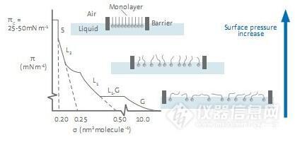 在進(jìn)行典型的等溫壓縮測(cè)試時(shí),單分子層先從二維的氣相(G)轉(zhuǎn)變到液相(L)最后形成有序的固相(S)。在氣相中,分子間的相互作用力比較弱;當(dāng)表面積減小,分子間的堆積更為緊密,并開始發(fā)生相互作用;在固相時(shí),分子的堆積是有序的,導(dǎo)致表面壓迅速增大。當(dāng)表面壓達(dá)到最大值即塌縮點(diǎn)后,單分子層的堆積不再可控。