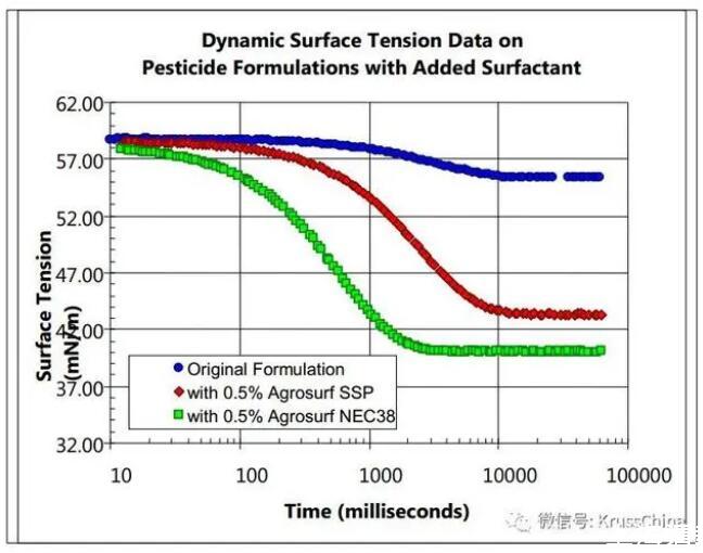 例如我們用KRSS的BP100動態(tài)表面張力儀測試添加了兩種不同表面活性劑農藥的動態(tài)表面張力。噴霧過程中尺寸效應的關鍵因素為初始表面張力降低的快慢,即通常認為是液滴形成后前250ms內的表面張力。從這個尺度來看,上述兩個皆不是優(yōu)異的表面活性劑。