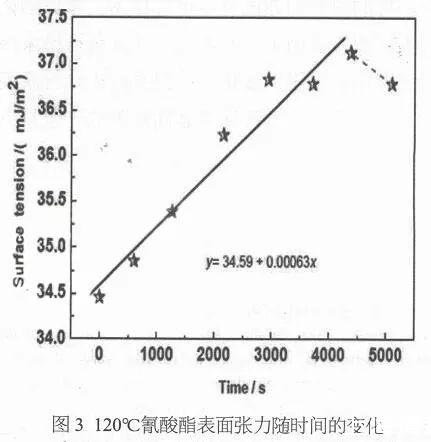 從圖3中,我們可以看到含固化劑的氰酸酯樹脂體系在恒溫溫度120℃下表面張力變化關(guān)系為線性增加段和表面張力突降段。