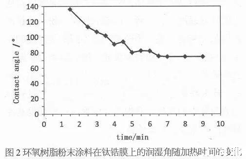 由圖2可知,環(huán)氧樹脂粉末涂料在熔融鋪展過程中的對鈦鋯膜的潤濕角整體呈降低趨勢,潤濕角由1.5min時的136°逐步降低至流平終點的74.6°。