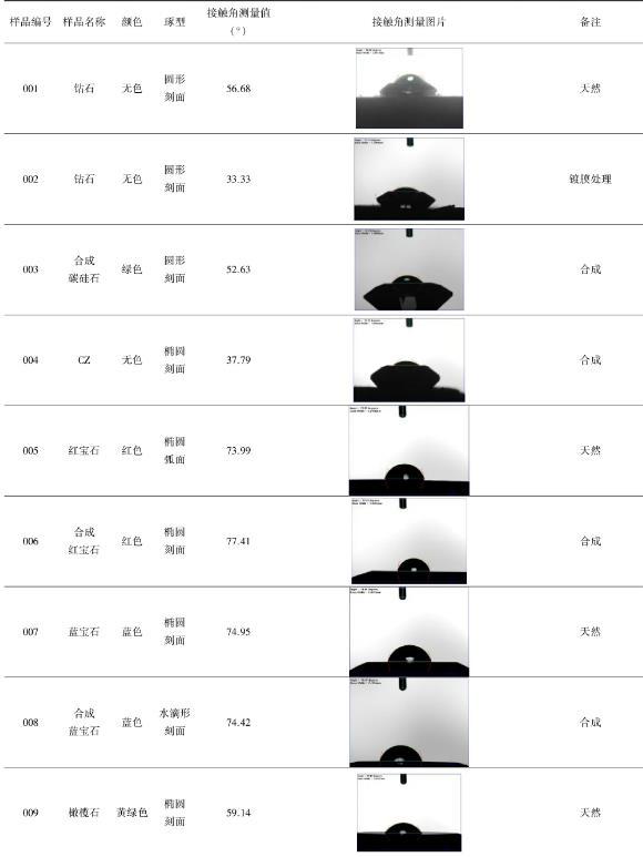 本文運(yùn)用現(xiàn)代儀器(FTA200動(dòng)態(tài)接觸角測量儀)測量了15個(gè)天然和合成寶玉石品種(鉆石、合成碳硅石、合成立方氧化鋯、碧璽、托帕石、翡翠、琥珀等),以及經(jīng)覆膜和充填2種處理方法的寶玉石樣品(鍍膜鉆石、覆膜托帕石、覆膜翡翠、覆膜琥珀、充填碧璽)的表面接觸角,并運(yùn)用公式計(jì)算其表面張力。