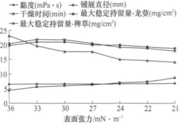 通過(guò)本研究可以說(shuō)明適當(dāng)?shù)亟档筒莞熟⒅苿┑谋砻鎻埩蛟黾羽ざ染商岣叱輨┑纳锘钚?。除草劑活性能否充分發(fā)揮往往決定于霧滴在雜草葉表面的黏著、展布、濕潤(rùn)、滲透與傳導(dǎo)。不同雜草的葉片結(jié)構(gòu)及生理機(jī)制往往對(duì)藥液理化性狀和藥液敏感性不同,本研究中液滴的鋪展直徑、干燥時(shí)間均采用石蠟?zāi)M植物葉片蠟質(zhì)層結(jié)構(gòu),僅能體現(xiàn)藥液理化性狀的相對(duì)變化趨勢(shì),而不同類型的雜草對(duì)藥液物理性狀和藥液敏感性需進(jìn)一步研究。