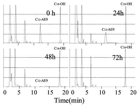用高效液相色譜法分析生物降解過程中AE 的色譜圖如圖8 所示,其中10 毫克/升C12-AE9 的峰出現(xiàn)在11 分鐘的保留時間,作為內(nèi)標(biāo)的C18 醇出現(xiàn)在18 分鐘的保留時間。 在 8 分鐘的保留時間之前觀察到主要由衍生產(chǎn)物引起的干擾峰。 10mg/L AE9 的大部分峰在 48 小時后消失(圖 8),而圖 3 中此時基于需氧量的生物降解保持 35%。此時表面張力值達(dá)到約 72.8 mN/m . 因此,表明AE9在其生物降解率低于50%的時間內(nèi)失去了其界面活性和水生毒性。
