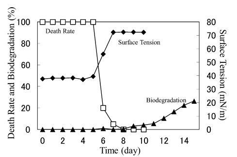 AE 的生物降解速度比 LAS 快。 對于 10 mg/L AE9,BOD 和表面張力值在測試開始后立即開始增加,死亡率立即下降(圖 3)。 表面張力值在第 2 天達(dá)到約 72.8 mN/m。 該結(jié)果與之前的報告一致9),其中比較了基于 CO2 量的生物降解率(測量的 CO2 產(chǎn)量/理論 CO2 產(chǎn)量)和 CTAS 的降低率。 也就是說,Strum 研究中 CTAS 的降低對應(yīng)于我們研究中表面張力值的增加。