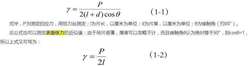 威廉米吊片法測(cè)定表面張力時(shí),將一個(gè)薄片如鉑金片、云母片或毛玻璃片等懸掛于液體之上,使其剛好與液面接觸。此時(shí)薄片受到液體的表面張力,受力不平衡,為維持原本的位置,就必須施加一個(gè)向上的拉力P,此力與表面張力大小相同、方向相反??梢杂上率接?jì)算表面張力γ: