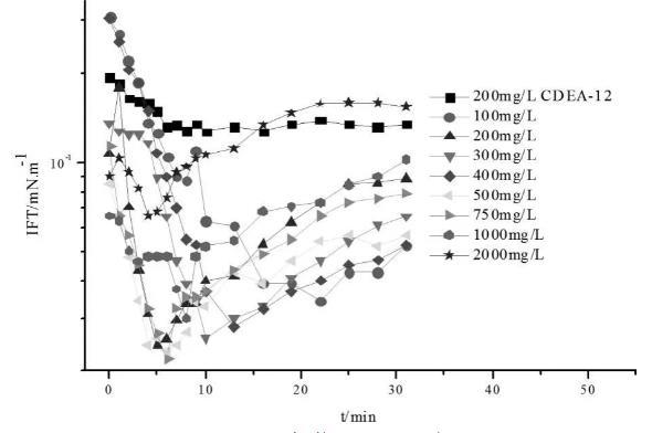 圖2濃度為200mg/LCDEA-12分別與不同濃度NNR復(fù)配油水動(dòng)態(tài)界面張力關(guān)系