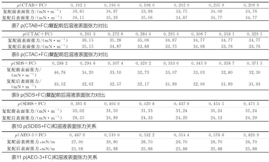 由表1可以得出FC質(zhì)量濃度為0.056 0 g/L時(shí)表面張力最低,以此為依據(jù)考察不同表面活性劑與FC協(xié)同作用。從表7~11可以看出:在FC質(zhì)量濃度均為0.056 0 g/L時(shí),隨著碳?xì)浔砻婊钚詣舛鹊脑黾?,?fù)配體系的表面張力逐漸下降然后趨于平衡。當(dāng)CTAB濃度為0.192 1 g/L時(shí),復(fù)配后較復(fù)配前下降3 mN/m;當(dāng)CTAC濃度為0.261 3 g/L時(shí),復(fù)配后較復(fù)配前下降1 mN/m;當(dāng)SDS濃度為0.288 2 g/L時(shí),復(fù)配后較復(fù)配前下降14 mN/m;當(dāng)SDBS濃度為0.395 6 g/L時(shí),復(fù)配后較復(fù)配前下降了4 mN/m;當(dāng)AEO-3濃度為0.487 9 g/L時(shí),復(fù)配后較復(fù)配前下降了近1 mN/m。由此可見(jiàn):氟碳與碳?xì)浔砻婊钚詣?fù)配后,溶液的表面活性相對(duì)增強(qiáng),表面張力明顯降低,依次為SDBS>AEO-3>SDS>CTAC>CTAB。