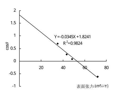參照Z(yǔ)isman作圖法,選取潔凈、無(wú)病斑的劍麻葉片,用刀片切成規(guī)則平整的小塊(避開(kāi)葉脈),用膠水將其固定在載玻片上,使用微量注射器分別吸取2μL已知表面張力的液體(乙二醇、DMSO、DMF和去離子水),點(diǎn)滴在劍麻葉片表面,置于接觸角測(cè)量?jī)x上,記錄此時(shí)液滴所成的接觸角θ,每個(gè)處理重復(fù)10次,取平均值。以這4種液體的表面張力值為橫坐標(biāo),cosθ為縱坐標(biāo),得到一條直線回歸方程,在cosθ=1(接觸角為0)處得到相應(yīng)的表面張力值即為劍麻葉片的臨界表面張力值。