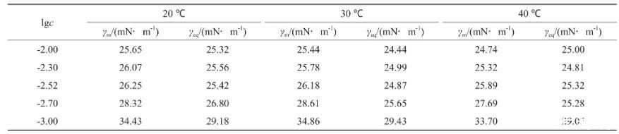 采用JK99C型表面張力儀由低濃度至高濃度測定恒溫后系列溶液的表面張力(γ),做γ-lgc(c為濃度)曲線。測試均在帶有恒溫夾套的玻璃杯中進行,外接數(shù)控超級恒溫槽,溫度控制在預設(shè)溫度,溫度選擇為20,30,40℃。