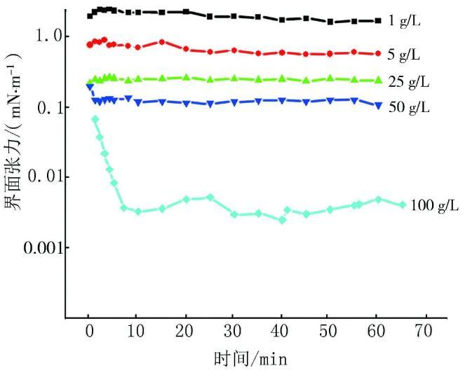 為了選擇合適界面張力體系來進(jìn)行驅(qū)油實(shí)驗(yàn),實(shí)驗(yàn)室內(nèi)配置了礦化度分別為1,5,25,50,100 g/L,質(zhì)量分?jǐn)?shù)為0.2%的9AS-3-0溶液,并對(duì)其與原油之間的界面張力進(jìn)行了測(cè)量。實(shí)驗(yàn)結(jié)果見圖1。