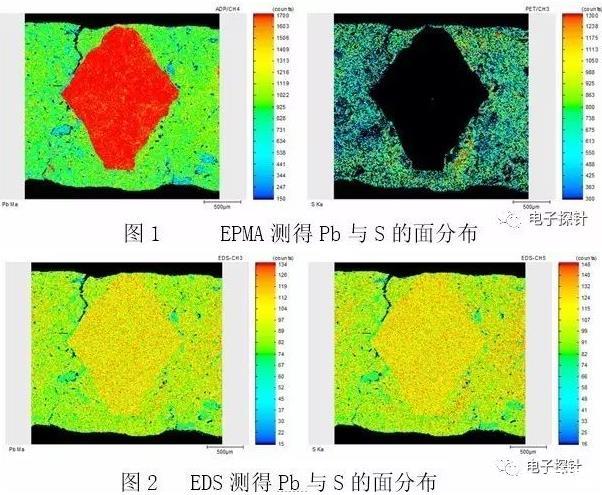 圖2為EDS測(cè)試結(jié)果,顯示Pb與S元素分布區(qū)域基本一致的現(xiàn)象,此為假象。這是由于兩個(gè)元素的主峰相互重疊,在能量上已不能被儀器區(qū)分開的緣故。