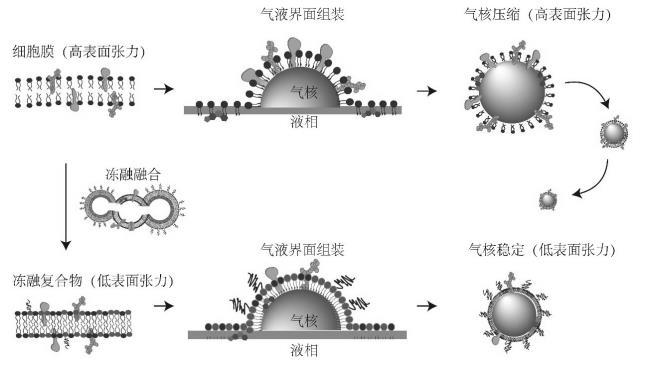 細胞膜是由蛋白質(zhì)與膽固醇等分子鑲嵌在磷脂中的典型雙分子層結(jié)構(gòu)。細胞膜仿生技術(shù)已經(jīng)成功實現(xiàn)在納米顆粒以及納米液滴表面修飾組裝,并實現(xiàn)體內(nèi)的長循環(huán)以及良好生物相容性。典型的細胞膜仿生技術(shù)是將剝離后的細胞膜直接以磷脂雙分子層的形式包被于納米顆?;蛞旱伪砻?。然而由于表面張力作用,細胞膜的磷脂雙分子層無法直接包被在微米級的氣泡表面。