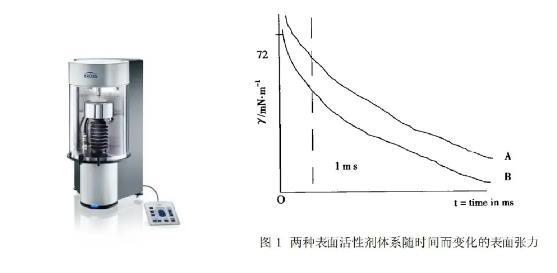 圖1顯示兩個(gè)不同表面活性劑體系A(chǔ)和B在不同吸附速度下,隨時(shí)間t而變化的表面張力γ,也可以叫作動(dòng)態(tài)表面張力。這些曲線可以通過使用KRüSS最大氣泡壓力法來測(cè)量。氣泡在表面活性劑溶液中以不同的頻率形成,控制氣泡形成的時(shí)間并且測(cè)量氣泡中所產(chǎn)生的最大壓強(qiáng),可以得到不同時(shí)間下的表面張力。在短時(shí)間內(nèi),觀察到表面活性劑體系B比A的體系所帶來的表面張力更小。