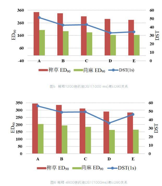 對于除草劑而言,藥液表面張力低于植物葉面潤濕臨界值大概25 mN/m,藥液就可以由氣孔直接滲入表皮。對于稀釋600倍條件下,D配方的動態(tài)表面力為23.14 mN/m,已經(jīng)低于雜草葉面的臨界值,那么藥液勢必更有效地滲透,藥效會更高,尤其對于葉片厚,蠟質(zhì)層稍厚的闊葉雜草會更加明顯。對于稀釋600倍條件下,E配方的動態(tài)表面張力為31.28 mN/m,略高于葉面的臨界值,可能對于闊葉雜草的防效會有所下降。把藥液表面張力與靶標(biāo)表面張力關(guān)聯(lián),可以初步看出,藥液表面張力越接近雜草葉面臨界表面張力值,藥液防效會越優(yōu)秀,當(dāng)偏離程度大時,除草活性會受到明顯影響。