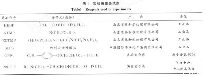 在化學(xué)驅(qū)提高采收率方法中,表面活性劑/堿復(fù)合驅(qū)的驅(qū)油效果比較好,這主要是由于堿與原油中酸性物質(zhì)反應(yīng)生成的活性劑與外加表面活性劑產(chǎn)生了協(xié)同效應(yīng),可以將油水界面張力降至低界面張力區(qū)域(10-2m N/m)甚至超低界面張力區(qū)域(10-3m N/m),并且堿可以降低活性劑在地層中的吸附。但在高堿濃度下,注入堿容易對(duì)驅(qū)油體系造成采出液處理困難、引起地層黏土分散和運(yùn)移、導(dǎo)致地層滲透率下降等負(fù)面作用,并且堿也與油層流體及巖石礦物反應(yīng),形成堿垢,對(duì)地層造成傷害并影響油井正常生產(chǎn)。解決結(jié)垢問題的主要方法是加入化學(xué)防垢劑,其中有機(jī)膦酸鹽防垢劑因其良好的防垢效果而有廣泛的應(yīng)用。