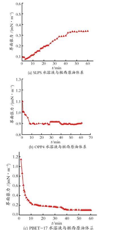 圖1 SLPS,OPP4和PBET-17水溶液-樁西原油體系油-水動(dòng)態(tài)界面張力