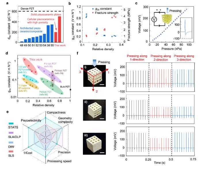 為進(jìn)一步闡述所開(kāi)發(fā)的STATS制造工藝的優(yōu)異性,研究團(tuán)隊(duì)制備了一系列經(jīng)過(guò)三維結(jié)構(gòu)設(shè)計(jì)的多孔壓電陶瓷,并對(duì)其機(jī)械性能和壓電性能進(jìn)行了表征(圖2)。STATS法加工的多孔壓電陶瓷具有整體多孔但局部致密的特點(diǎn),即使在相對(duì)密度(多孔陶瓷與實(shí)心塊體陶瓷的密度比值)較低的情況下(0.13-0.34),也能具有較高的斷裂強(qiáng)度(1.0-3.9 MPa)和壓電常數(shù)d33(200 pC N-1)。為進(jìn)一步評(píng)估壓電陶瓷超材料的壓電響應(yīng),研究團(tuán)隊(duì)基于由周期性結(jié)構(gòu)單元組成的有機(jī)骨架制備了一系列具有不同三維結(jié)構(gòu)的多孔壓電陶瓷,該方法加工的壓電陶瓷展示出優(yōu)異的壓電響應(yīng)和各向異性。