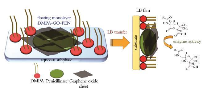 此外,將經(jīng)典兩親分子的Langmuir單層與酶結(jié)合是保持生物大分子催化性能的一種方式。F.A.SCHLL等研究了磷脂LB膜固定化青霉素酶(PEN),將GO加入青霉素酶‐脂質(zhì)Langmuir單層膜中,并作為L(zhǎng)B膜轉(zhuǎn)移到固體載體上,評(píng)估了酶的催化性能(見(jiàn)圖3)。結(jié)果表明,GO作為由2,2‐二羥甲基丙酸(DMPA)和PEN組成的LB膜的添加劑,被固定在LB膜的PEN中;GO存在于酶脂LB膜中,不僅可以調(diào)節(jié)青霉素酶的催化活性,而且有助于數(shù)周后仍保持其酶活性。研究結(jié)果加強(qiáng)了混合納米結(jié)構(gòu)薄膜的重要性,證明了使用由脂質(zhì)、GO和酶組成的LB膜應(yīng)用于光學(xué)生物傳感器的可行性,對(duì)應(yīng)用傳感器的生物電子設(shè)備研究具有重要意義。