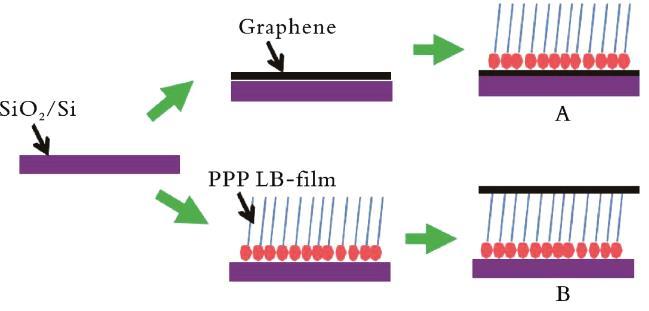 石墨烯作為一種新型二維超薄碳材料,易于吸附分子,是天然的襯底。當(dāng)某些分子吸附在石墨烯表面時(shí),分子的拉曼信號(hào)會(huì)得到明顯的增強(qiáng),這種拉曼增強(qiáng)效應(yīng)被稱(chēng)為石墨烯增強(qiáng)拉曼散射效應(yīng)(GERS)。X.LING等為了進(jìn)一步證實(shí)GERS中的化學(xué)增強(qiáng)機(jī)制,使用LB技術(shù)構(gòu)建了原卟啉Ⅸ(PPP)的單層或多層有序聚集體以及與石墨烯接觸的PPP的可控分子構(gòu)型(見(jiàn)圖1)。