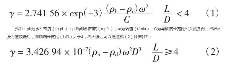 式中:ρh為水相密度(mg/L);ρd為油相密度(mg/L);ω為轉(zhuǎn)速(r/min);C為與油滴長寬比相關(guān)的系數(shù)。當(dāng)界面張力值較低時,即油滴長寬比(L/D)大于4,界面張力可以通過式(2)計算: