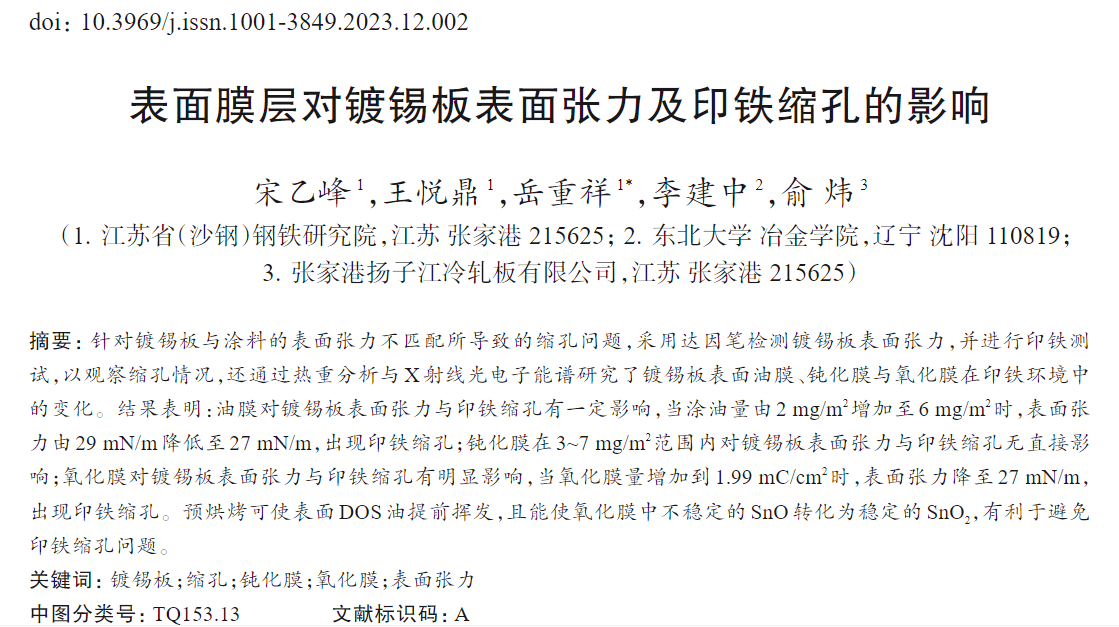 結(jié)果表明:油膜對(duì)鍍錫板表面張力與印鐵縮孔有一定影響,當(dāng)涂油量由2 mg/m2增加至6 mg/m2時(shí),表面張力由29 mN/m降低至27 mN/m,出現(xiàn)印鐵縮孔;鈍化膜在3——7 mg/m2范圍內(nèi)對(duì)鍍錫板表面張力與印鐵縮孔無(wú)直接影響;氧化膜對(duì)鍍錫板表面張力與印鐵縮孔有明顯影響,當(dāng)氧化膜量增加到1.99 mC/cm2時(shí),表面張力降至27 mN/m,出現(xiàn)印鐵縮孔。預(yù)烘烤可使表面DOS油提前揮發(fā),且能使氧化膜中不穩(wěn)定的SnO轉(zhuǎn)化為穩(wěn)定的SnO2,有利于避免印鐵縮孔問(wèn)題。