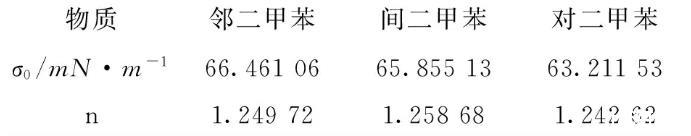 表3鄰二甲苯、間二甲苯和對(duì)二甲苯表面張力實(shí)驗(yàn)結(jié)果