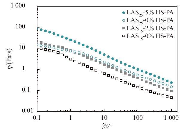 圖7為不同配方洗滌劑的表觀黏度隨剪切速率變化曲線,隨著剪切速率不斷增加,4個樣品的表觀黏度均逐漸減小,表現出剪切變稀的非牛頓流體行為。在恒定剪切速率下,體系中加入HS-PA將提高洗滌劑的黏度。結合偏光顯微鏡圖像可知,HS-PA的加入使得分子空間堆積構型發(fā)生改變,體系中出現更多的球形層狀液晶,液晶結構越多越完整,則說明其形成的聚集體中,分子排布越緊密且越有序,層間發(fā)生滑動時越困難,宏觀表現為黏度越大。當無HS-PA影響時,在相同剪切速率下,活性物質量分數越高,黏度越大。這可能是因為活性物質量分數越大,表面活性劑分子之間作用力越強,分子鏈發(fā)生相對運動時的阻礙效果越明顯,黏度則越大。