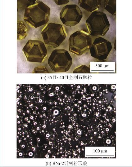 金剛石磨粒的抗壓和耐磨性能與其自身品級有關(guān),精選河南黃河旋風(fēng)股份有限公司晶形完整、強(qiáng)韌度好、無缺陷的高品級HSD90型人造金剛石,圖1為金剛石和BNi-2釬料粉的形貌,其中金剛石的原始形貌如圖1a所示,所用粒度為35目——40目。釬涂試驗(yàn)前,利用角磨機(jī)或噴砂機(jī)清理基材表面,然后利用丙酮進(jìn)行超聲波清洗30 min,以避免試驗(yàn)過程雜質(zhì)干擾,保證金剛石磨粒的透光性。釬涂試驗(yàn)基材為65Mn鋼,激光釬涂試樣尺寸為200 mm×100 mm×10 mm.釬料合金既要潤濕金剛石和鋼基材,形成冶金結(jié)合,又要兼顧耐磨性,與涂層硬質(zhì)顆粒耐磨性能匹配。選用釬料合金為200目NiCrSiB(Ni82Cr7Si4.5B3.1Fe3,后文簡稱BNi-2)釬料,形貌如圖1b所示。BNi-2釬料具有耐磨性好、成本低等優(yōu)點(diǎn),合金中Cr元素可大幅提高釬料/金剛石界面結(jié)合強(qiáng)度,B元素和Si元素的添加降低了釬料熔點(diǎn),有助于減少金剛石熱損傷。