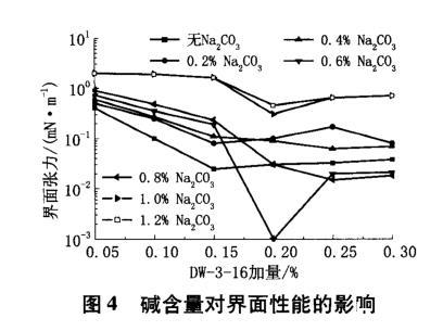 三元復(fù)合驅(qū)中注入堿能引起地層黏土分散、運(yùn)移,導(dǎo)致地層滲透率下降,堿與油層流體及巖石礦物反應(yīng),可形成堿垢,對地層造成傷害,會引起油井結(jié)垢,影響油井正常生產(chǎn);加入堿能大幅降低聚合物的黏彈性。因此,堿對DW-3-16表面活性劑性能的影響至關(guān)重要。