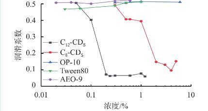 表面活性劑濃度是影響體系潤(rùn)滑性能的重要原因之一。單一濃度無(wú)法全面系統(tǒng)地評(píng)價(jià)表面活性劑的潤(rùn)滑性能,因此,進(jìn)一步探究表面活性劑濃度對(duì)潤(rùn)滑性能的影響,測(cè)定了不同濃度的5種表面活性劑在硅酸鈉水溶液中的潤(rùn)滑系數(shù),如圖1所示。