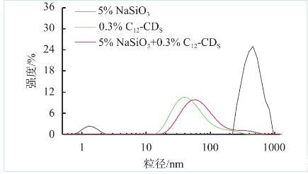 為進一步明確兩親性碳點對硅酸鹽溶液的潤滑機理,通過動態(tài)光散射儀(Malvern Zetasizcrnano ZS90,Malvern,英國)測定硅酸鈉溶液、硅酸鈉與兩親碳點和硅酸鈉與聚氧乙烯型表面活性劑的混合溶液水動力學直徑,其中散射角為173°,測試溫度為30℃。如圖6所示,質量分數(shù)為5%的Na2SiO3粒徑分布在220~800 nm之間,平均粒徑約為514.0 nm;質量分數(shù)為0.3%的C12-CDS溶液的粒徑主要分布在8~100 nm之間,平均粒徑為43.4 nm;而5%Na2SiO3+0.3%C12-CDS的混合溶液粒徑為10~120 nm,平均粒徑為63.2 nm,C12-CDS的加入使得Na2SiO3聚集體的尺寸大大降低,這表明C12-CDS可以讓Na2SiO3聚集體解聚,這與表面活性劑對膠體溶液的分散作用相關。由于大量C12-CDS分子或膠束吸附在Na2SiO3聚集體表面形成具有機械阻礙作用的水化膜,可對Na2SiO3聚集體起到穩(wěn)定分散作用。
