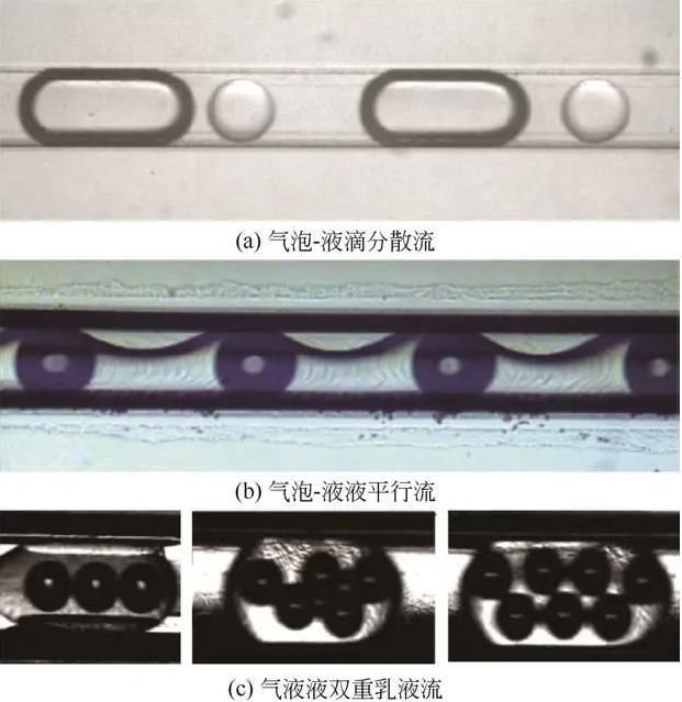 上述不同類型的微通道中所形成的流型也是學者們重點關(guān)注的內(nèi)容。在材料制備領域,流型是決定合成材料結(jié)構(gòu)的關(guān)鍵因素且直接影響著材料的相關(guān)性能;在過程強化領域,不同流型的強化效果差別較大,選擇并調(diào)控合適的流型是重中之重;在三相反應中,流型可決定反應的轉(zhuǎn)化率和選擇性,是需要優(yōu)化的重要參數(shù)之一。相比于兩相體系,三相體系由于流體間更為復雜的相互作用及更高的自由度而呈現(xiàn)出了更多的流動形態(tài)(圖3)。如Su等在十字形微通道中成功調(diào)控出液滴氣泡間隔排列的氣液液三相流。Xu等基于同軸環(huán)管微設備實現(xiàn)了氣液液雙乳液的可控制備,并揭示了流量和界面張力等因素對雙乳液結(jié)構(gòu)的影響。Wang等在雙T形通道內(nèi)通過調(diào)節(jié)操作條件可控制備了“水包油包氣”和“含有氣泡的液液平行流”兩種結(jié)構(gòu)。Rajesh等通過觀察液滴氣泡的形狀及位置關(guān)系定義了“氣柱-液柱”“彈狀-液滴”“液柱-雙氣彈”等流型。除了實驗手段Rajesh等借助VOF數(shù)值模擬方式從機理上揭示了氣液液三相流的流動規(guī)律,歸納了不同Ca和We范圍內(nèi)的流型特征和規(guī)律。此外,Yang等通過傳質(zhì)引發(fā)相分離的方法成功調(diào)控出氣液液雙乳液,該方法能實現(xiàn)更大范圍內(nèi)氣泡直徑尺寸和液膜厚度的調(diào)節(jié)。