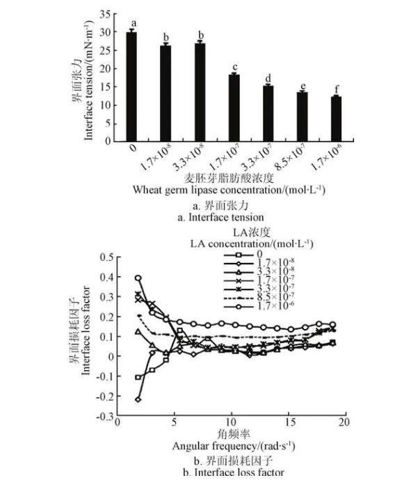 圖1b是不同濃度麥胚LA對油水界面損耗因子(tanδ)即損耗角正切值的影響。tanδ越大,耗散能量的能力越強;由圖可見,tanδ隨麥胚LA濃度的增加而增加,當(dāng)麥胚LA濃度為1.70×10-6mol/L,tanδ值達(dá)到最大。該變化趨勢與界面張力變化趨勢有一定的相似性,原因可能是,麥胚LA濃度具有兩性特性,易富集在油水界面上。隨著其濃度的增加,導(dǎo)致界面黏度增加,進(jìn)而影響了因界面形變而耗散的能量。綜上,為了能夠觀察到明顯而準(zhǔn)確的試驗結(jié)果,在后續(xù)研究中選取麥胚LA的濃度為1.70×10-6mol/L。