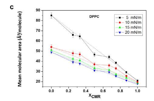 觀察到 CMR/DPPC 與 DAE 的正偏差 由于更不混溶的行為而導(dǎo)致的混合膜(圖 5c 和 6c)。 偏差程度取決于表面 壓力,因?yàn)樵诟叩膲毫ο?,分子變得更?包裝中分子間相互作用的影響變得不那么明顯(Chou 和 Chang,2000)。 令人厭惡的 行為表明相分離有利于分子聚集(Mishra 等,2012)。 得到了類似的結(jié)果 其他香豆素(Sarpietro 等人,2011 年;Chakraborty 等人,2012 年)。