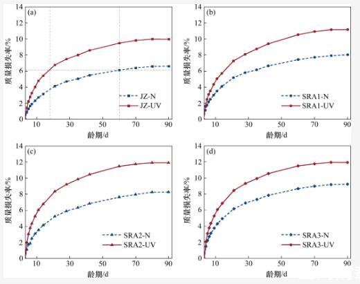 暴露在強(qiáng)紫外線輻射環(huán)境中的各組試樣的質(zhì)量損失率均明顯大于標(biāo)準(zhǔn)干燥環(huán)境中試樣的質(zhì)量損失率。在3~21 d齡期內(nèi),各組試樣在強(qiáng)紫外線輻射環(huán)境中的質(zhì)量損失增長速率明顯大于其在標(biāo)準(zhǔn)干燥環(huán)境中的質(zhì)量損失增長速率。以基準(zhǔn)組(JZ)為例,強(qiáng)紫外線輻射環(huán)境下水泥石在18 d齡期時的質(zhì)量損失率達(dá)到標(biāo)準(zhǔn)干燥環(huán)境下水泥石在60 d齡期時的質(zhì)量損失率(穩(wěn)定值),并最終在90 d齡期時,JZ-UV組的質(zhì)量損失率達(dá)到了JZ-N組的1.5倍。這是強(qiáng)紫外線輻射的“光化學(xué)作用”引起的。當(dāng)水分子吸收光子后,內(nèi)部的電子會發(fā)生能級躍遷,形成不穩(wěn)定的激發(fā)態(tài),并發(fā)生離解反應(yīng),使H—O鍵斷裂生成H+和HO-,從而加速水分子的運(yùn)動,促進(jìn)了水泥石表面的干燥,增大了水泥石體系內(nèi)部與外部環(huán)境的濕度梯度,導(dǎo)致水泥石中的水分快速散失。