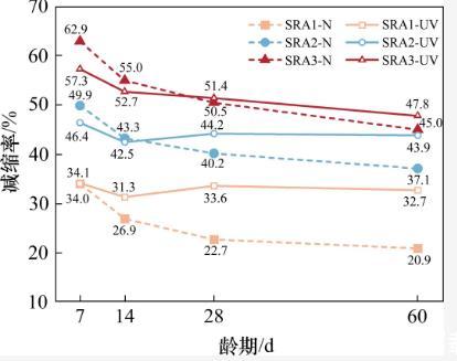 從圖3中可以觀察到,隨著齡期的延長,干縮曲線SRA2-UV逐漸接近于干縮曲線SRA3-UV,而SRA3-UV的干縮值沒有進(jìn)一步降低。這表明上述分析是合理的。在強(qiáng)紫外線輻射下,當(dāng)減縮劑的摻量超過3%時,其孔隙溶液中的SRA濃度超過臨界濃度(CMC),進(jìn)一步增大摻量不能增強(qiáng)SRA在該應(yīng)用環(huán)境中的減縮效果。