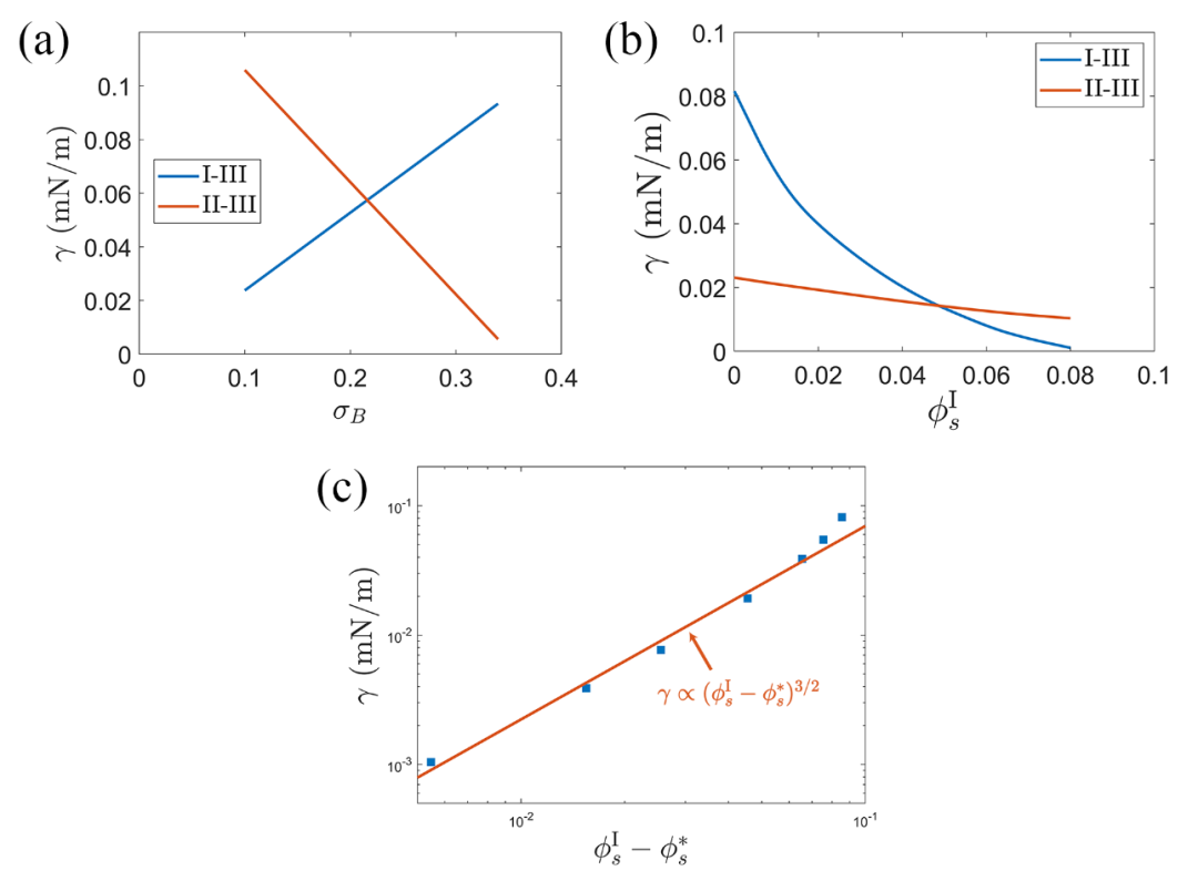 圖1.(a)I-III相與II-III相間的界面張力隨B鏈線電荷密度σB變化的曲線。(b)I-III相與II-III相間的界面張力隨外加鹽離子濃度變化的曲線。(c)接近臨界鹽時(shí)I-III相界面張力與鹽濃度之間的標(biāo)度關(guān)系。