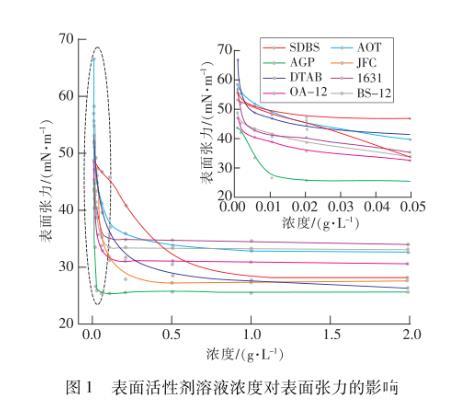 由圖2可見,8種表面活性劑溶液表面張力隨濃度變化的趨勢大體上相同,但其臨界膠束濃度及表面張力有較大差別。溶液臨界膠束濃度越小,說明表面活性劑分子在溶液中形成膠束的能力越強(qiáng)。8種表面活性劑的臨界膠束濃度主要集中在濃度為0.1~0.4 g/L左右,其中APG的臨界膠束濃度最小為0.04 g/L,SDBS的最大為0.53 g/L,8種表面活性劑形成膠束能力由強(qiáng)到弱排序為:APG>BS-12>1631>OA-12>JFC>DTAB>AOT>SDBS,總體呈現(xiàn)出兩性型>非離子型>陽離子型>陰離子型的規(guī)律。溶液的γcmc值越小,表面活性劑降低表面張力的能力越強(qiáng),陰離子和非離子型的4種表面活性劑γcmc值均較低,其中APG降低表面張力能力最強(qiáng),γcmc值僅為25.61 mN/m,比水降低了65.15%。而陽離子和兩性型的表面張力較高,均在31.00 mN/m以上,1631降低表面張力的能力最弱,表面張力為34.79 mN/m。8種表面活性劑降低表面張力的能力由強(qiáng)到弱依次排序如下:APG>JFC>AOT>SDBS>OA-12>CTAB>BS-12>1631,總體而言,非離子型>陰離子型>兩性型>陽離子型。APG的臨界膠束濃度和表面張力都最低,這可能是因為APG分子為環(huán)狀結(jié)構(gòu),環(huán)狀結(jié)構(gòu)的碳原子上連接有醇羥基,這些醇羥基與水分子之間存在強(qiáng)相互作用,且在水溶液中溶解度很高,因此有效降低了溶液的表面張力,也更易形成膠束。