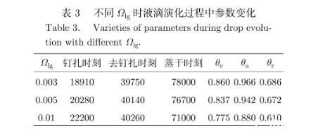 表3不同Ωlg時(shí)液滴演化過程中參數(shù)變化