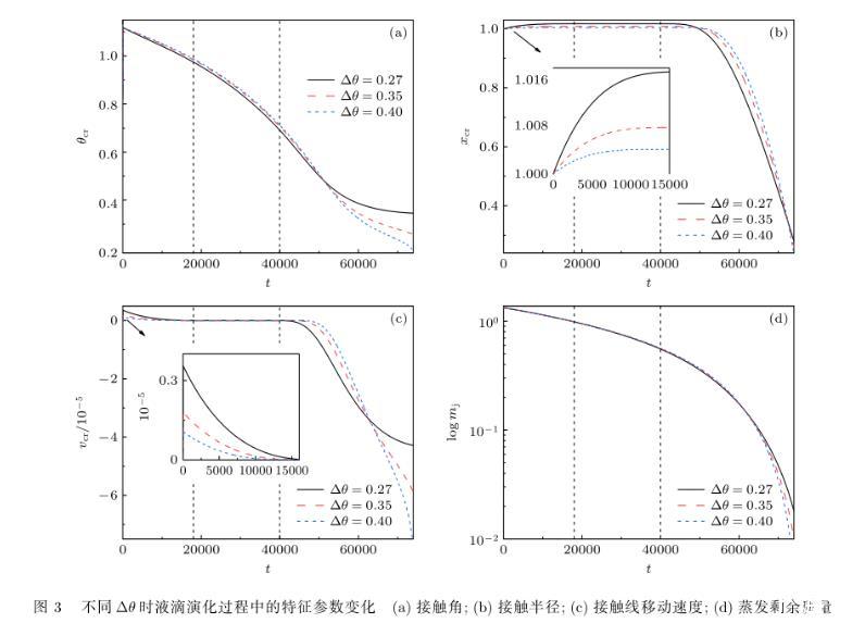 圖3(d)表明,接觸角遲滯加快了液滴的蒸干過程.當(dāng)t=74000時(shí),Δθ=0.40情形下的液滴接近蒸干,此時(shí)液滴質(zhì)量為0.00479;而Δθ=0.27和0.35時(shí)的液滴質(zhì)量為0.01805和0.01009,分別約是Δθ=0.27情形下的3.77倍和2.11倍,即隨著遲滯角的增大,液滴剩余質(zhì)量減小(圖3(d)),液滴蒸干過程加快.