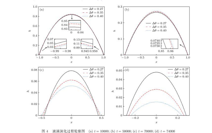 液滴演化過程如圖4所示,由圖4(a)可知,在鋪展階段,隨著遲滯角的增大,液滴鋪展半徑縮小,液滴厚度增大,但因該階段液滴表面溫度較低,蒸發(fā)速率較慢,不同遲滯角下的液滴輪廓差異并不顯著.圖4(b)—圖4(d)表明,在去釘扎階段,當(dāng)遲滯角增大時(shí),液滴收縮速度加快,液滴厚度減小.隨著時(shí)間的推移,液滴表面溫度提高,蒸發(fā)速率也不同程度地增大,液滴輪廓逐漸顯出差異;由圖4(d)可知,t=74000時(shí),Δθ=0.27,0.35和0.40下的液滴收縮半徑分別為0.2798,0.2579和0.2352,液滴高度分別為0.04825,0.0291和0.01496,即遲滯角越大,液滴收縮半徑和高度都越小.