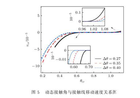 圖5比較了三種遲滯角下動(dòng)態(tài)接觸角與接觸線移動(dòng)速度間的對(duì)應(yīng)關(guān)系.可以看出,遲滯角對(duì)鋪展、釘扎和去釘扎階段等全過程均有不同程度的影響,在釘扎階段,Δθ=0.27下的液滴前進(jìn)接觸角和后退接觸角分別為θa=0.966和θr=0.696,Δθ=0.35和0.40下液滴對(duì)應(yīng)于θa=0.997,θr=0.647和θa=1.016,θr=0.616.如表2所列,隨著遲滯角的增大,前進(jìn)接觸角增大,后退接觸角減小,后退接觸角減小的幅度大于前進(jìn)接觸角增大的幅度,這與Karapetsas等的研究結(jié)果一致.因此,可通過改變遲滯角來改變前進(jìn)、后退接觸角,控制接觸線釘扎時(shí)間,從而調(diào)控液滴蒸發(fā).