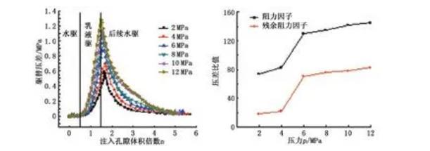 (3)隨著壓力的升高,阻力因子和殘余阻力因子均逐漸增加,在壓力由4 MPa升至8 MPa過程中,阻力因子大幅增加,壓力的升高使巖心封堵過程中的最高壓差提前出現(xiàn)。