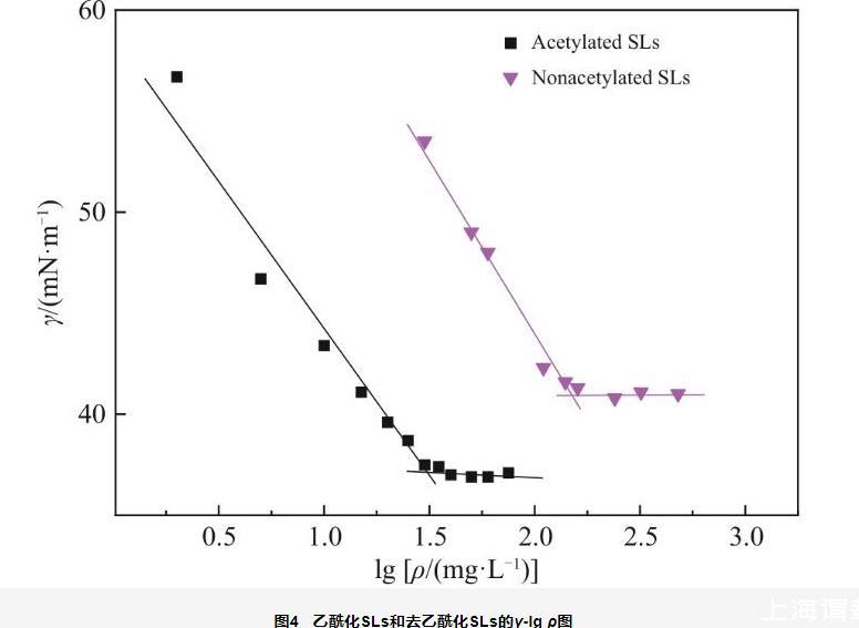 乙?;疭Ls和去乙?;疭Ls的溶解性、濁點(diǎn)和耐酸堿性如表3所示,可以看出,去乙?;疭Ls在水中的溶解度達(dá)到485.8 g/L,較乙酰化SLs提高了14倍以上。這是由于去乙?;疭Ls中含有豐富的親水羥基,能夠與水分子形成穩(wěn)定的氫鍵。乙酰化SLs濁點(diǎn)為36℃,可能限制其在高溫環(huán)境中的應(yīng)用;去乙?;疭Ls則無明顯濁點(diǎn),這是由于其組分中自由酸性和bola型SLs占絕對(duì)優(yōu)勢(shì),這2類糖脂組分的分子轉(zhuǎn)動(dòng)自由度高,使其不易結(jié)晶。另外,乙?;碧侵瑸橛袟l件的耐酸級(jí),但是為非耐堿級(jí);去乙?;疭Ls則為非耐酸堿級(jí),這可能是由于SLs的分子含有的β-糖苷鍵或羧酸基團(tuán)容易在酸堿條件下發(fā)生水解。2類SLs均具有良好的抗硬水性能,達(dá)到最高級(jí)5級(jí)。