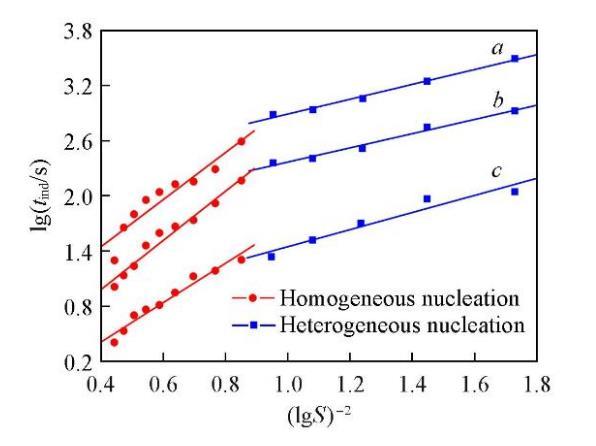 誘導期與初始過飽和度之間存在著很強的依賴關(guān)系.當初始過飽和度足夠高時,成核可認為是均相的;當初始過飽和度足夠低時,成核則以非均相為主[37].在恒定溫度下,由晶體成核過程中的lgtind對(lgS)?2作圖可得兩條斜率不同的直線,分別對應著兩種不同的成核機制,即初級均相成核和初級非均相成核[37].由不同溫度時Li2CO3的lgtind對(lgS)?2作圖,結(jié)果如圖3所示.可知,成核機制的變化引起了直線斜率的改變,均相成核對應的直線斜率明顯大于非均相成核時的直線斜率(Bhom>Bhet).在較低的過飽和度時,成核以非均相成核為主;而過飽和度增大到12.13以后,成核則以均相成核為主.