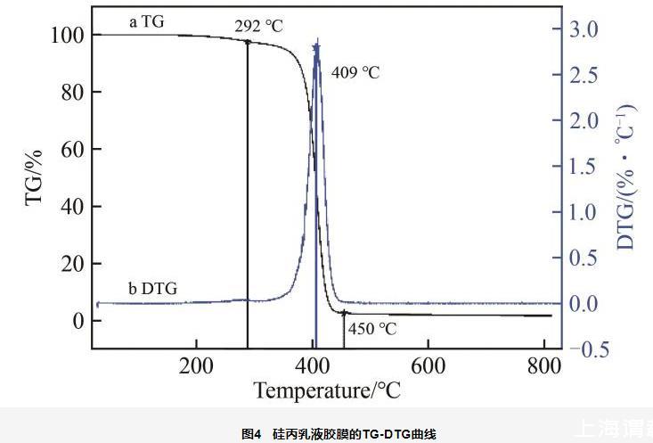 從圖4可以看出,膠膜失重分為3個階段:在292℃前,失重2.54%,此時失去的是膠膜中的水及小分子物質(zhì)的揮發(fā),膠膜并未發(fā)生分解;293~450℃之間為共聚物的熱分解階段,該范圍失重95.30%,且分解速度較快,主要是Si—O、C—C、C—O和C—H鍵的斷裂所致;450~800℃之間失重0.43%,這是共聚物分子鏈的斷裂和分解,分解速度較為緩慢;800℃基本分解完全,僅剩下1.73%的灰分,證明硅丙乳液膠膜具有良好的耐熱性。由DTG曲線可以看出,409℃熱分解速率最大,說明硅丙乳液具有良好的熱穩(wěn)定性,這是因為在共聚物分子中引入了具有較高鍵能的Si—O—Si鍵的結(jié)果。