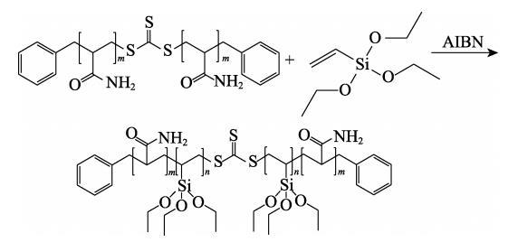 在500 mL四口燒瓶中加入300 g無(wú)水乙醇、0.0231 g(0.14 mmol)AIBN和10.0816 g(0.28 mmol)PAM-CTA-4,用超聲波將PAM-CTA-4混合均勻分散,再加入VTES〔其中,n(VTES)∶n(AM)=5∶100、10∶100、15∶100、20∶100〕,在70℃下反應(yīng)8 h。反應(yīng)結(jié)束后趁熱出料,過(guò)濾。在超聲條件下,用正己烷洗滌沉淀,過(guò)濾,重復(fù)數(shù)次,在45℃真空干燥24 h,得到PAM-b-PVTES固體粉末。將上述不同n(VTES)∶n(AM)制得的產(chǎn)物依次命名為PAM-b-PVTES-1、PAM-b-PVTES-2、PAM-b-PVTES-3、PAM-b-PVTES-4。
