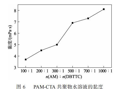 由圖6可知,隨著DBTTC用量的減少,共聚物水溶液黏度緩慢提升,由3.7 mPa·s逐漸升高到8.1 mPa·s,這是因?yàn)椋S著RAFT試劑用量的減少,共聚物相對(duì)分子質(zhì)量增加,共聚物鏈段增長(zhǎng),共聚物鏈段之間的纏繞作用增強(qiáng),共聚物水溶液黏度升高。適當(dāng)?shù)卣{(diào)節(jié)RAFT試劑的用量可以達(dá)到控制共聚物水溶液黏度的目的。