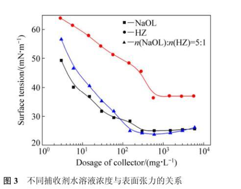 表面張力是影響浮選過程中氣泡的穩(wěn)定性,以及氣泡形成難易程度的主要參考數(shù)據(jù),臨界膠團濃度(簡稱CMC)是反映表面活性劑降低水溶液表面張力的效率。組合用藥的浮選效果優(yōu)于單一用藥,這可能與其在水溶液中的表面張力有一定的關(guān)系。圖3所示為最佳pH條件下(pH=9.0)組合捕收劑與兩種單一捕收劑的水溶液濃度與表面張力的關(guān)系。NaOL在水中微量的添加顯著地降低了水的表面張力,而隨著NaOL濃度的增加,溶液的表面張力逐漸下降,在濃度為302 mg/L時溶液的表面張力達到最低,為22.7~24.8 mN/m。此后NaOL濃度的增加并不能顯著地降低水的表面張力,所以可以確定NaOL的CMC值約為302 mg/L,與文獻中報道的1.03×10?3mol/L(308 mg/L)接近。而HZ的CMC值568 mg/L,表面張力36.37 mN/L。作為一種表面活性劑,其表面活性明顯不如NaOL,在較高濃度下,HZ才能形成膠團。浮選HZ用量為200 mg/L,低于其CMC值,在此濃度下,膠團未形成,表面張力較高,起泡性不佳,在單礦物浮選試驗中表現(xiàn)出了泡沫量小的特點。組合捕收劑水溶液的表面張力測試結(jié)果表明,CMC值約為150 mg/L,CMC值下水溶液表面張力為24.88 mN/m。可見HZ的添加能降低NaOL的CMC值,這可能是NaOL作為一種陰離子型表面活性劑,親水“離子頭”之間的靜電作用較強,非離子表面活性劑的“插入”到親水“離子頭”之間,同時亞氨基也存在一定程度的解離,使得離子之間的靜電斥力減小。